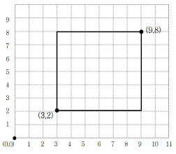 이 문제에서 모든 직사각형은 두 꼭짓점의 좌표를 나타내는 4개의 정수 x y p q 로 표현된다. 단 항상 x<p, y<q 이다. 예를 들어 위 그림에 제시된 직사각형이라면 아래와 같이 표현된다.