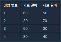 가장 긴 가로 길이와 세로 길이가 각각 80, 70이기 때문에 80(가로) x 70(세로) 크기의 지갑을 만들면 모든 명함들을 수납할 수 있습니다. 하지만 2번 명함을 가로로 눕혀 수납한다면 80(가로) x 50(세로) 크기의 지갑으로 모든 명함들을 수납할 수 있습니다. 이때의 지갑 크기는 4000(=80 x 50)입니다.