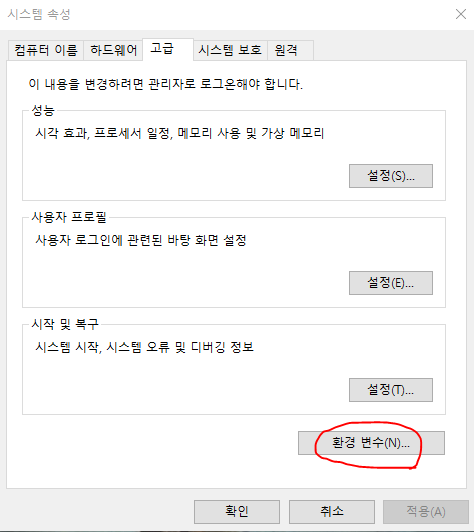 그러면 아래와 같은 창이 뜨는데 빨간 동그라미(환경 변수)를 클릭해줍니다.