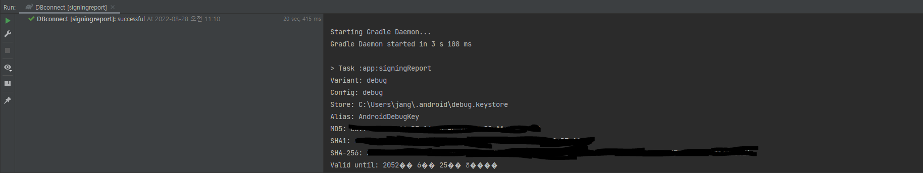 그리고 조금 기다리면 아래와같은 창이나오고 여기서 SHA1 의 키를 확인하면됩니다.